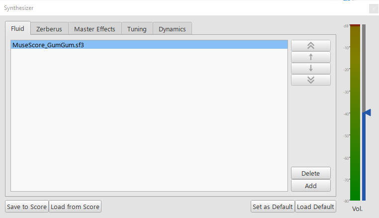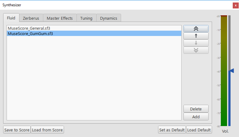 Selects the synthesizer. The default MuseScore synthesizer is Fluid which uses SF2/SF3 soundfonts. MuseScore also includes the Zerberus synthesizer which uses SFZ<synti>Zerberus</synti>. The Aeolus synthesizer is not currently supported.